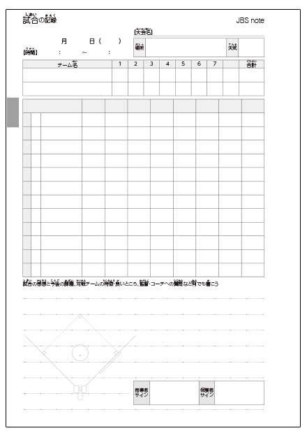 【試合の記録】 試合の日時と場所や天気、試合結果などが書き込めます。 自分のチームの選手名を書いて簡易スコアとして使えば、攻撃の様子を振り返ることができます。 投手は相手チームの記録をして自身の被安打や取った三振の数など確認しても良いでしょう。 試合の感想と今後の課題、対戦チームの特徴・良いところ、監督・コーチへの質問など、その日のうちに書き留めておくことをおすすめします。